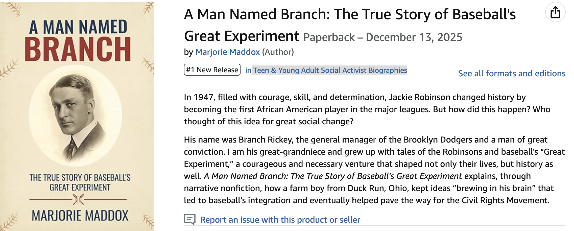 “My maternal grandparents were Brooklyn Dodger fans and were lucky enough to see Jackie Robinson play at Ebbets Field. Marjorie Maddox’s A Man Named Branch brings this incredible period of American history—not just baseball history—to life. Maddox, a relative of Rickey, illuminates the man behind Robinson’s call to the majors—his courage, ambition, and upbringing—through a compelling narrative perfectly consumable for middle grade readers. Maddox’s work includes new anecdotes and insights about Rickey that paint an honest and accessible portrait of a true pioneer.”