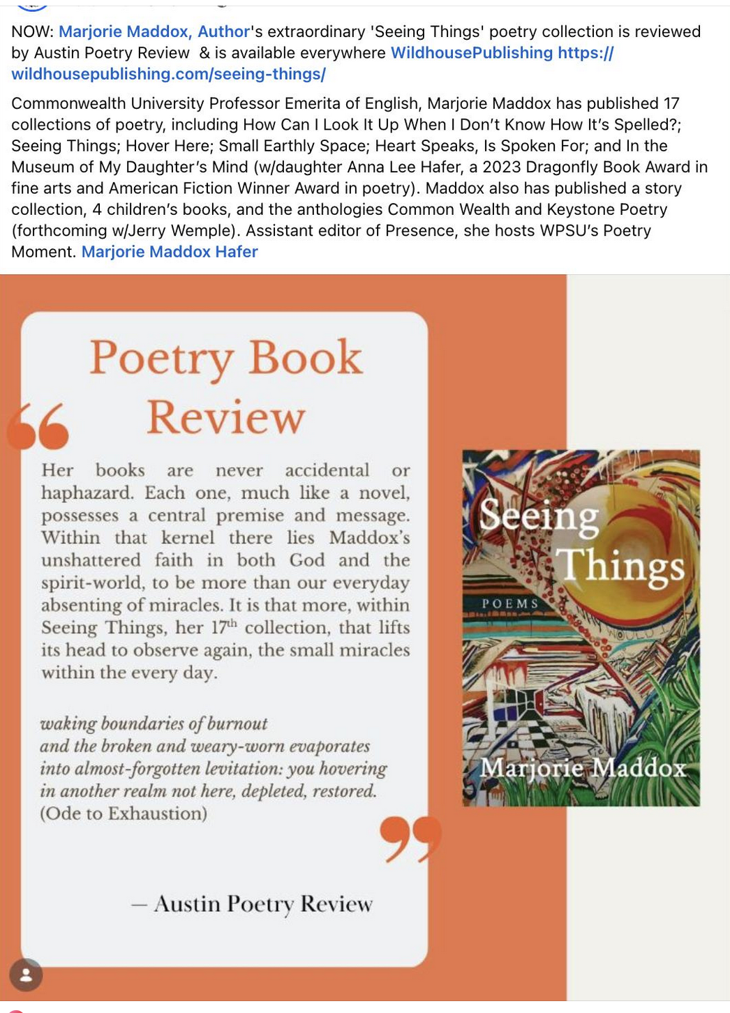 Reviewed by D. S. Martin on his blog Kingdom Poets. Excerpts here: “. . . . Her new book Seeing Things (2025, Wildhouse Publishing) will appear on February 28th. Amid the advance praise for this poetry collection, Jeanne Murray Walker has said, “It’s surely one of the best books I have read this year.” It is a very personal book where Marjorie Maddox finds herself between her mother’s advancing dementia and her daughter’s depression, with troubling memories of her own.