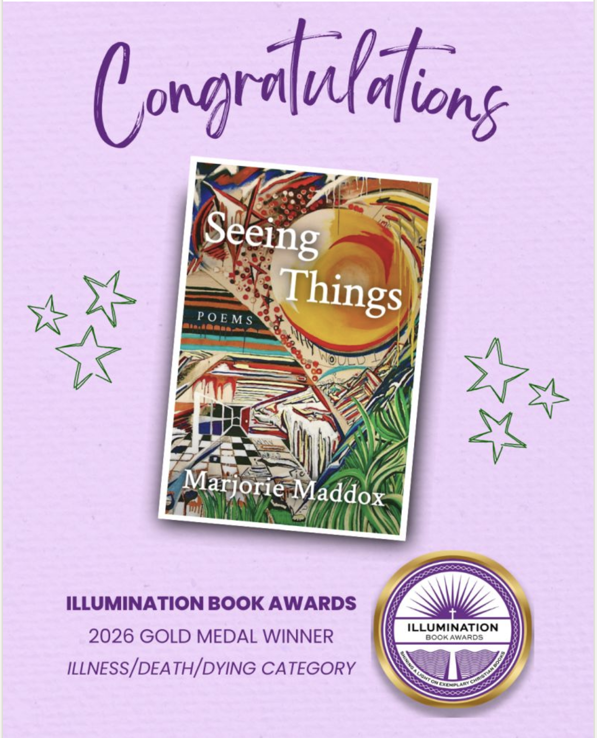 Praise Be, indeed. Seeing Things is a quiet and moving book of poetry, and a companion to those who have walked the same path the author chronicles so vividly here. Marjorie Maddox has done it again.” -Jody Collins